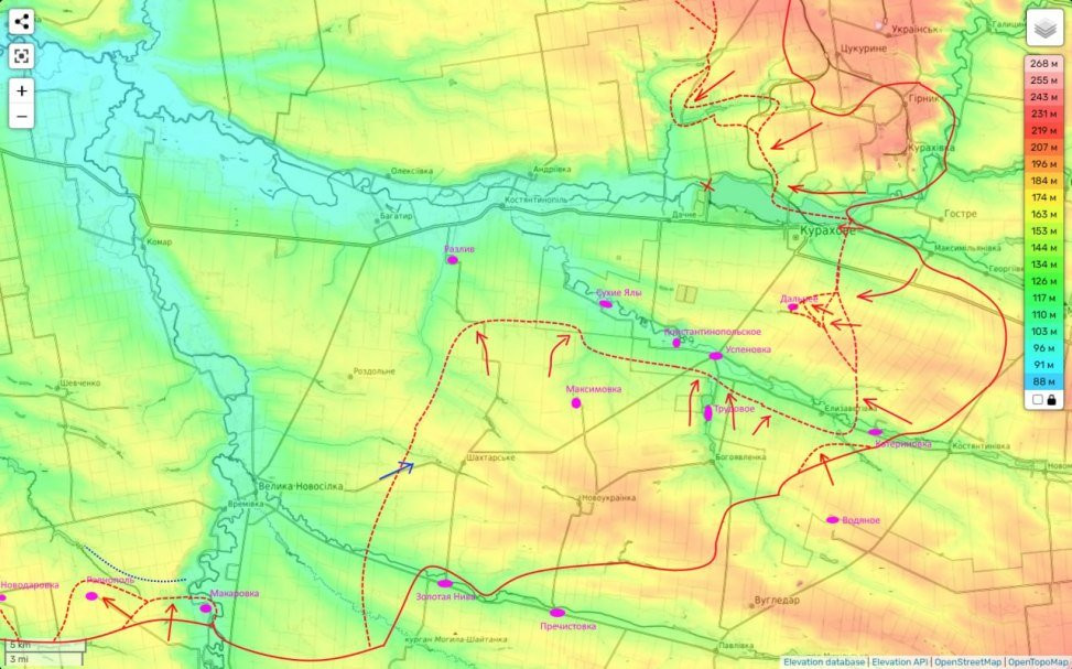 Во-первых, к вечеру наши штурмовики зашли и закрепились в н.п. Дальнее. Тем самым до физического перерезания дороги Курахово-Успеновка осталось буквально несколько километров.