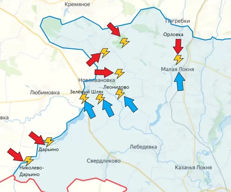 На северном участке продолжается наступление ВС РФ. Наши бойцы продвигаются в направлении Малой Локни. Где именно удалось закрепиться на текущий момент - неизвестно. Наименее оптимистичные источники даже Орловку не отмечают подконтрольной ВС РФ, а наиболее оптимистичные рассказывают о боях в северных окраинах Малой Локни.