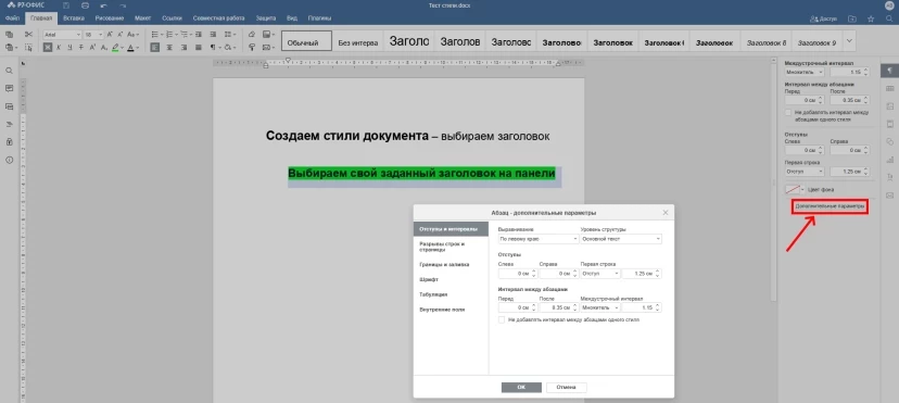 Помимо верхнеуровневой настройки в программе можно задать и другие более точечные параметры для композиции текстов. Для этого нажмите вкладку Дополнительные параметры на правой Боковой панели интерфейса редактора. В результате появится окно Абзац – дополнительные параметры, в котором можно прописать все необходимые требования к документу.