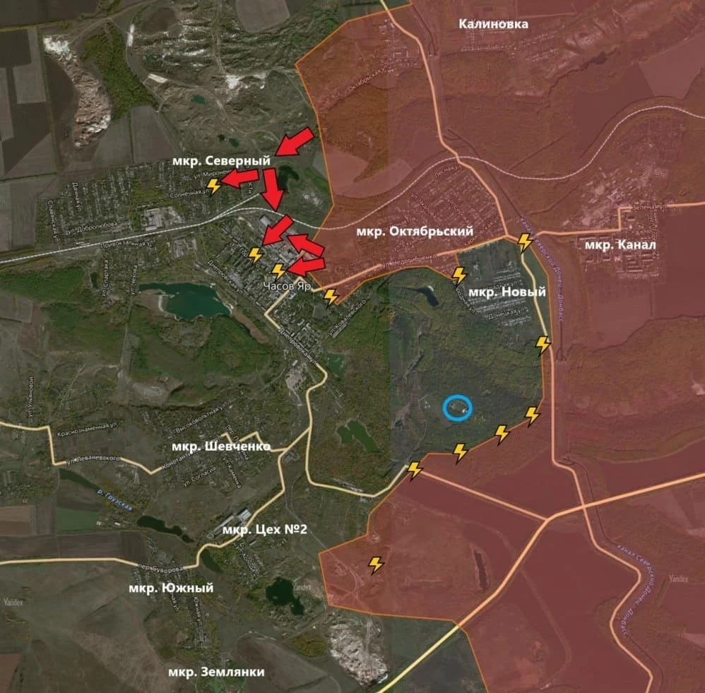На Константиновском направлении продолжается штурм Часов Яра. В микрорайоне Северный идут встречные бои. Сообщается, что подразделения ВС РФ завершают зачистку Часовоярского огнеупорного завода в центральной части города (там располагаются цеха 3 и 5). Под контролем ВСУ остаётся незначительная территория промзоны на западных её окраинах. Южнее микрорайона Новый идут бои. Наши бойцы пытаются нанести огневое поражение врагу в его опорнике. Если удастся взять под контроль этот участок, то боевики, находящиеся в микрорайоне Новый, попадут в окружение, пишет PulsePen.