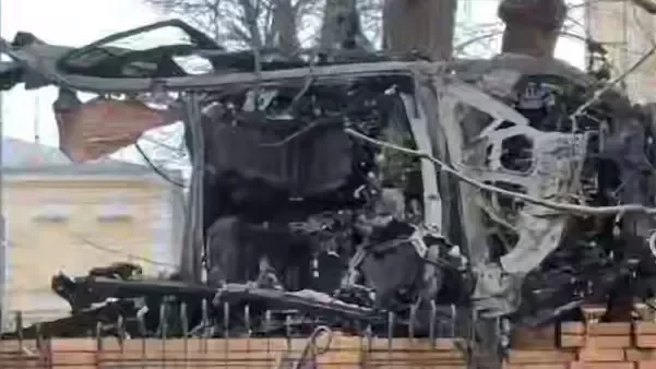 В городе взрывной волной авто забросило на забор. Судя по кадрам, от машины практически ничего не осталось - она сгорела.
