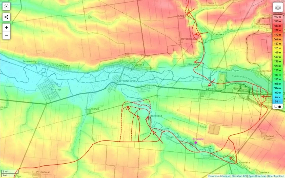 Причина понятна. Именно опираясь на эти позиции, наши части сумели выйти в тыл линии обороны противника расположенной вдоль оврага по сёлам Солёное - Песчаное - Зверовое. Её успешный прорыв даст нам возможность более свободно далее двигаться в северо-западном направлении (с целью обрезания коммуникаций группировку ВСУ в Покровске). Отсюда и попытки противника.