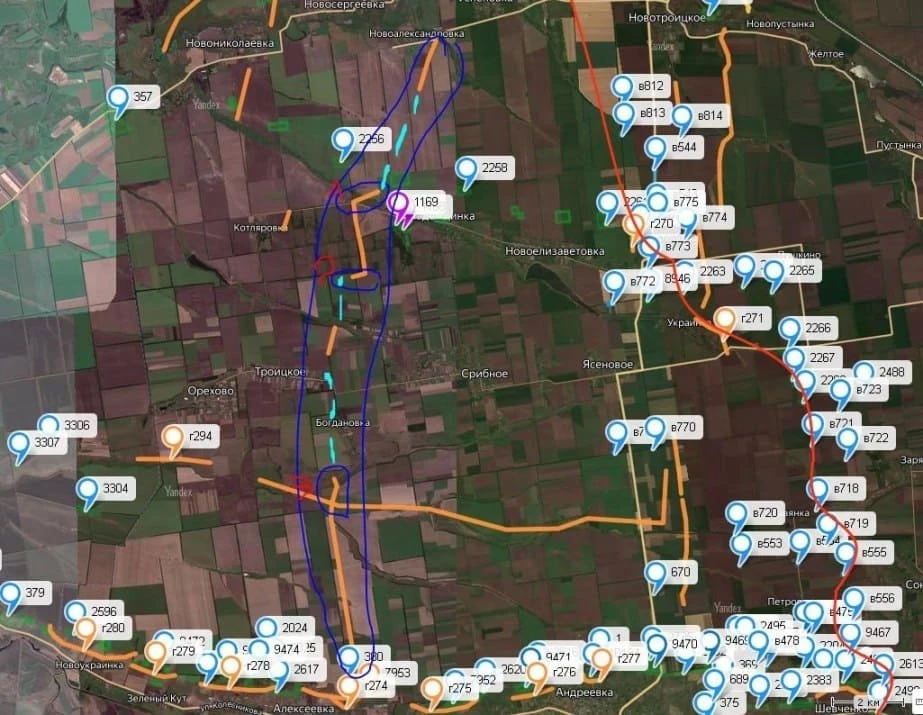 "Вторая карта показывает где у противника находятся его укрепления. Как раз сейчас на линии Новооленевка - Украинка наши штурмовики проламывают его очередную линию обороны", - уточнил военный блогер.
