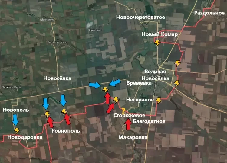 На Великоновосёлковском направлении появились кадры объективного контроля из Сторожевого и Макаровки. Населённые пункты перешли под контроль Армии России. Сообщается, что западнее сторожевого в районе Белой Горы враг по-прежнему удерживает один из опорников.