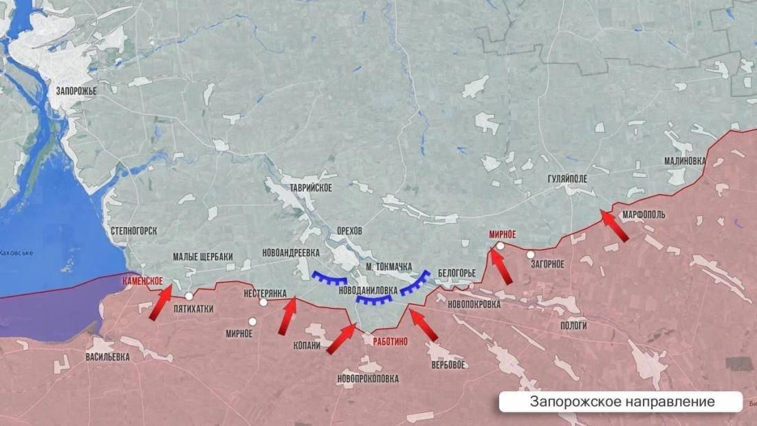 Запорожское направление. В течение года это направление так и осталось в зоне второстепенных. Шли тяжелые бои на участке Работино-Вербовое. В мае освобождено Работино, которое стало местом ожесточённых боев в ходе украинского контрнаступления летом 2023 года. Кроме этого, в июне нашим бойцам удалось занять Загорное, в октябре - Левадное, в ноябре - Новодаровку. Учитывая паритет сил на этом направлении, скорее всего армия России, придерживаясь тактики «малых котлов», не будет штурмовать Орехов в лоб, а окружит Гуляйполе, усилив давление на этот город захватом Великой Новосёлки. За последние недели декабря вооруженные силы России восстановили позиции севернее Работино по состоянию на 1 июня 2023 года.