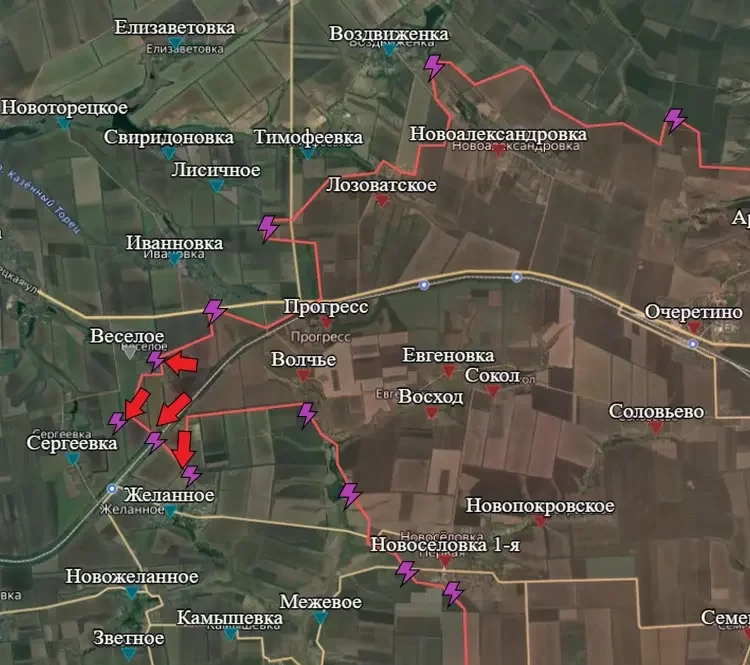 Чуть южнее наши бойцы подошли к окраинам населённых пунктов Сергеевка и Желанное. На текущий момент идёт подготовка к началу штурмовых действий, информирует PulsePen.