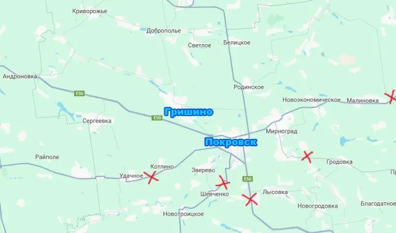 Теперь, как считает украинский военкор Богдан Мирошников, российские войска сосредоточатся на операции по вклиниванию в направлении села Гришино, что к северо-западу от Покровска. Село находится севернее дороги Е50, которая на данный момент представляет собой основной маршрут снабжения ВСУ в Покровске.