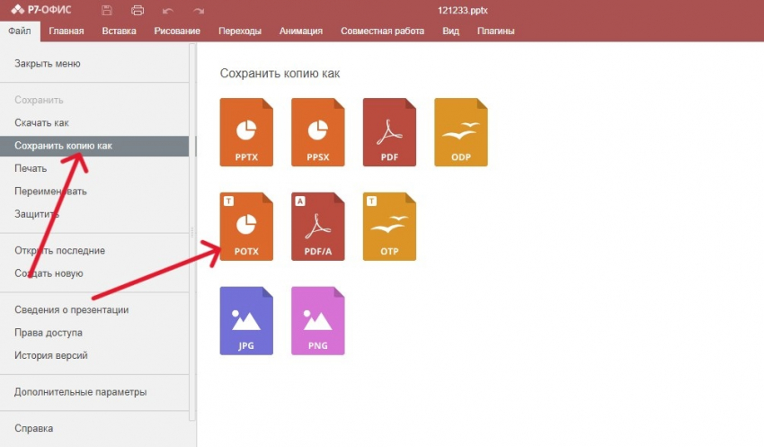 Чтобы создать шаблон для презентации, необходимо достаточно открыть  презентацию, которую вы хотите сделать шаблоном, а затем в верхней панели инструментов открыть вкладку «Файл» и нажать на «Сохранить копию как» и выбрать тип файла *.potx. Это расширение файла — для шаблонов презентаций.