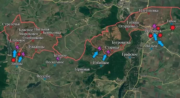 На Харьковском направлении на западном участке наши бойцы держат оборону в Глубоком. Враг продолжает попытки своих атак, но безуспешно. Также ВСУ наносят удары по позициям ВС РФ при помощи дронов-камикадзе. Армия России, в свою очередь, наносит удары по позициям ВСУ при помощи авиации - уничтожаются штурмовые группы (личный состав и техника), ПВД и склады и с БК. На восточном участке продолжаются бои близ Старицы и в Волчанске. В последнем боестолкновения идут севернее и восточнее Волчанского агрегатного завода. Поступают сообщения, что наши бойцы теснят противника и медленно, но верно выдавливают его с недавно занятых им позиций. Наша авиация работает по позициям ВСУ в самом Волчанске и в Тихом. При попытках ВСУ перебросить десант в северную часть населённого пункта через Волчья, по врагу наносятся удары при помощи БПЛА.