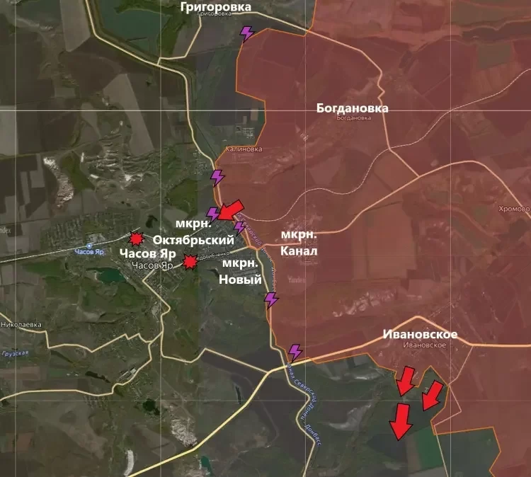 В Часов Яре продолжаются ожесточённые бои на восточных окраинах микрорайона Октябрьский. Существенного продвижения подразделениям Армии России достичь не удаётся. Стороны наносят по позициям друг друга артиллерийские удары, а также удары FPV-дронами. Ситуация совсем не располагает к продвижению.