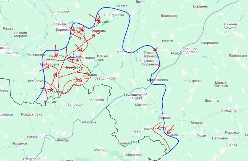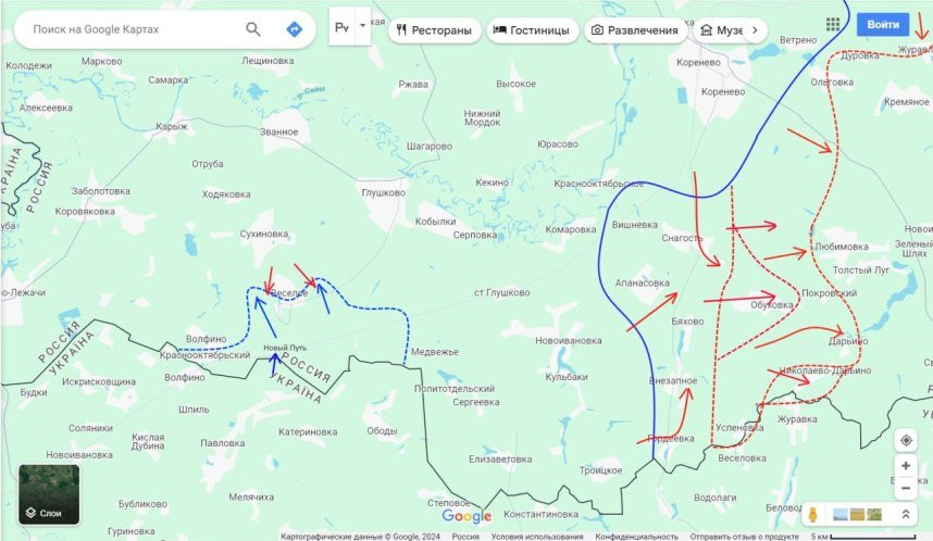 При этом не прекращая давления на противника в районе Ольговки-Кремяного-Журавлей на севере, они вчера, взяв и полностью зачистив от противника н.п. Николаево-Дарьино и Дарьино, сумели тем самым на большой протяженности переправиться через реку Снагость и занять за ней удобный плацдарм для дальнейшего удара на Свердликово (важнейшего логистического пункта противника, через который они в августе совершали прорыв в Курскую область)