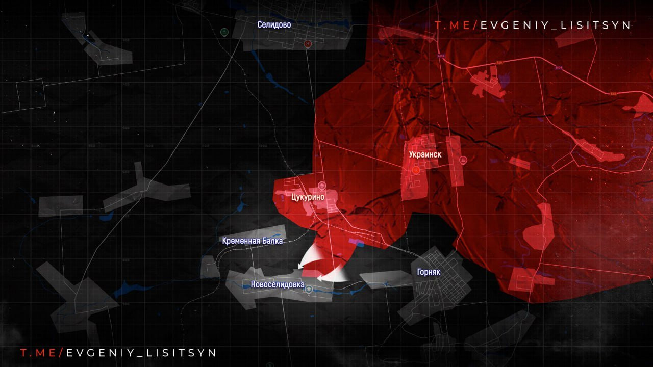 На Покровском направлении наши парни берут Селидово в «клещи». В Цукурино идет зачистка, западнее идет штурм птицефабрики. В так называемом «Невельском кармане» наши ещё расширили зону своего контроля, постепенно сокращая размер выступа. Об этом в своём Telegram-канале сообщает военный корреспондент Евгений Лисицын.