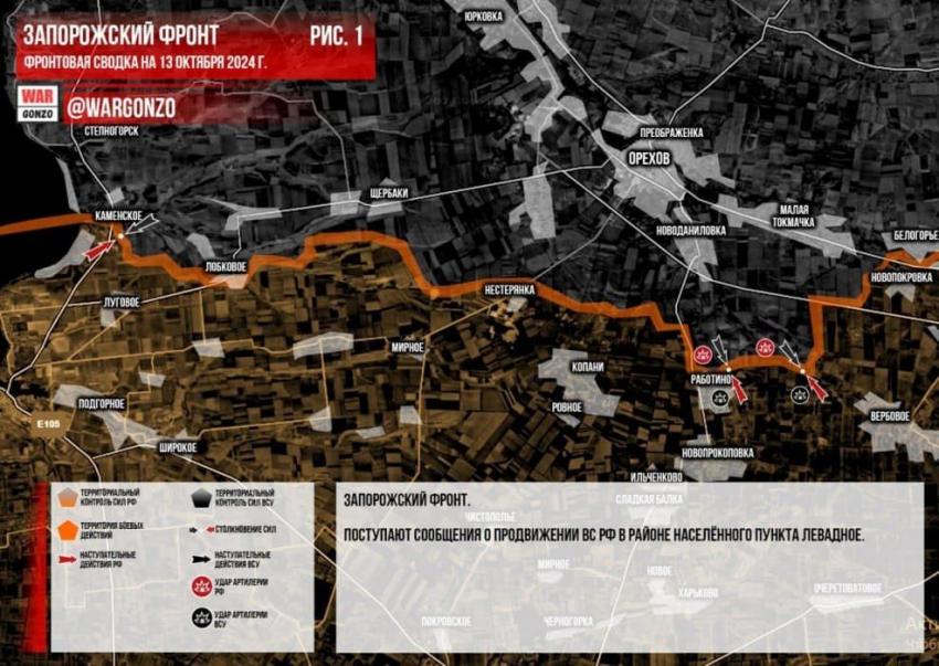 На Запорожском направлении, как пишет Telegram-канал Wargonzo, стало известно о продвижении ВС РФ в районе населённого пункта Левадное.