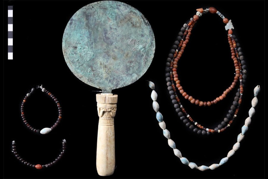 Два женских захоронения содержали редкие медные зеркала с резными ручками из слоновой кости. Одно из зеркал имеет ручку в форме лотоса, а другое имеет более сложный и редкий дизайн четырехликой женщины, представляющей богиню Хатхор. Лица интенсивные с прямым ртом и пронзительным, прямым взглядом.