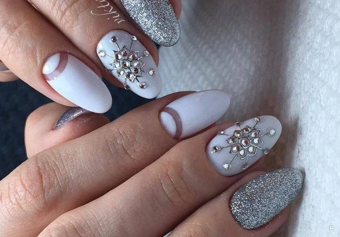 Маникюр «ледяной перламутр» создаст эффект заснеженных ногтей, переливающихся на свету. Обилие перламутровых частичек придаст ногтям холодный, но очаровательный вид, идеально подходящий для зимних праздников.